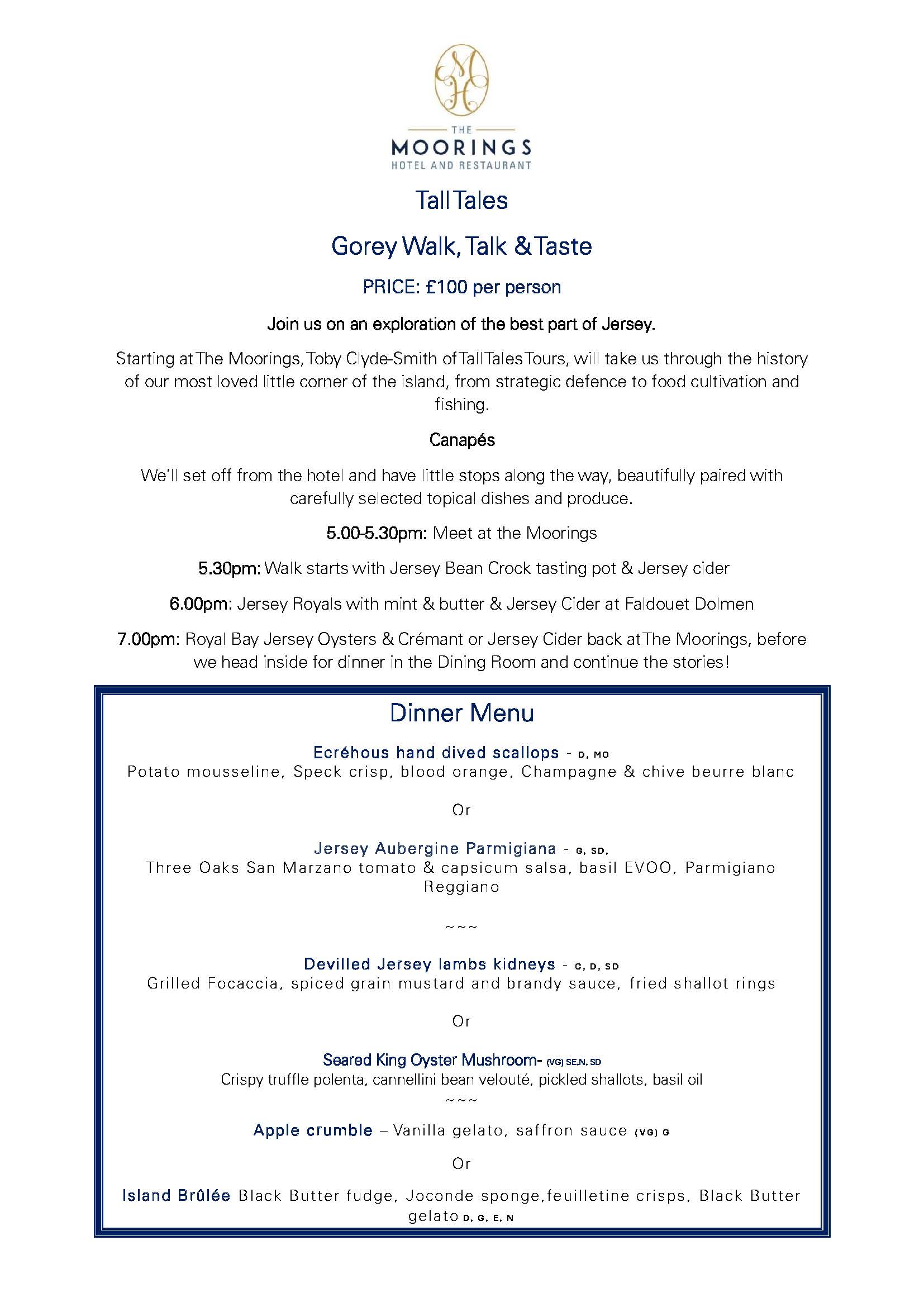There will be little stops along the way to wet the appetite before returning to The Moorings for a 3-course dinner, again celebrating our location and coastal surroundings.